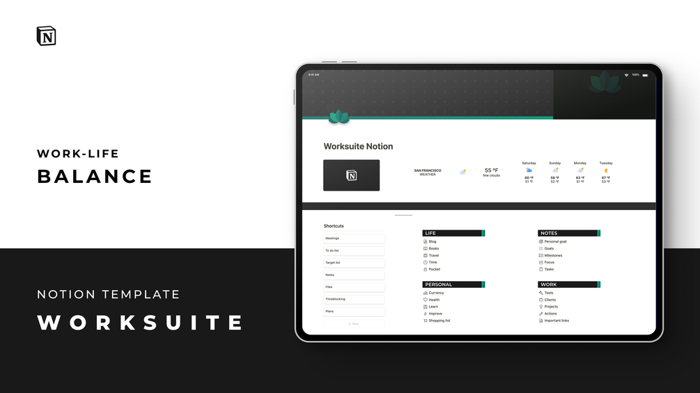 Worksuite is a notion template, designed to help an individual manage all important aspects of professional and personal life in a unified workspace.